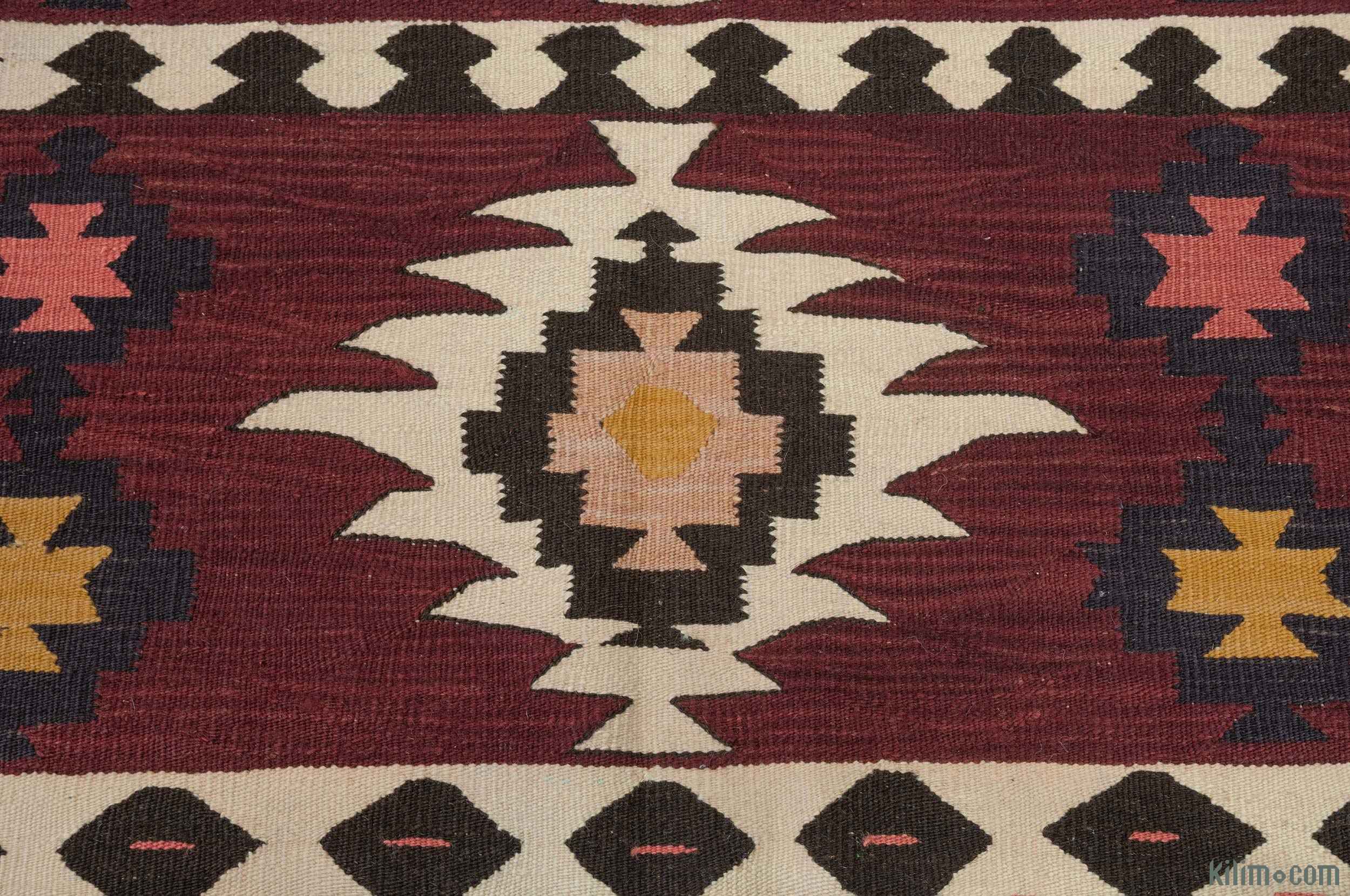 A kilim rug is flat-woven with no pile, showcasing geometric patterns and bright, vibrant colors on both sides.